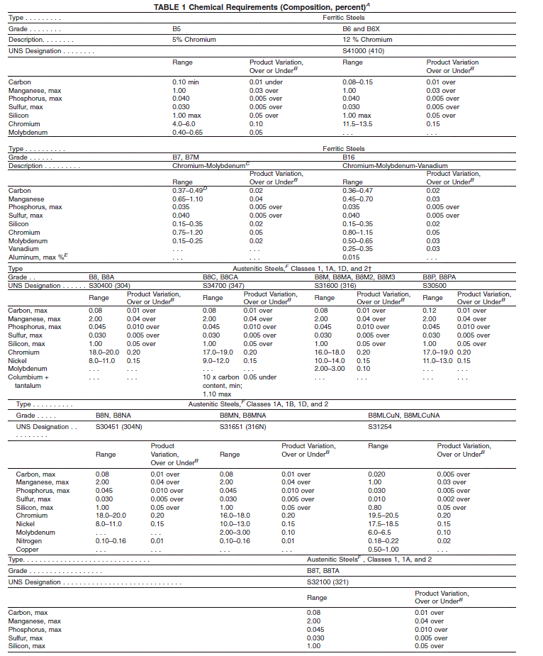بیشترین ارجاع این استاندارد در تولید استاد بولت می باشد. آنالیز شیمیایی متریالهای مصرفی برای هر گرید طبق جدول شماره 1 استاندارد به شرح ذیل می باشد: